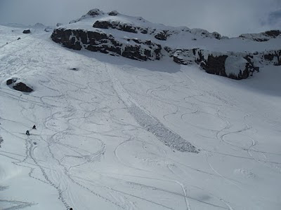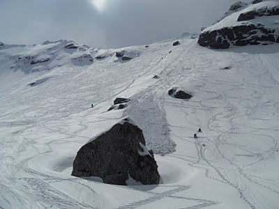 Obs: Cand am iesit din cabana am vazut prima avlanasa in spatele unui schior, sub pragul mare. Nu a fost surprins. Alti 4 schiori au mai declansat avalanse acolo fara a fi insa surprinsi. Mai tarziu insa, unul nu a avut noroc si a nimerit fix in mijlocul uneia. Am reusit sa si pozez asta. A scapat ok. Cea mai mare avnalasa a fost insa in dreapta potecii de urcare spre creasta pisicii (langa steag). A curs din extrema stanga a pragului…mult! L-a surprins pe un tip care schia si l-a tarat vreo 300m. Din cate am auzit, s-ar fi ales cu o fractura; nu e nimic confirmat- asa am auzit p-acolo… Probabil s-a si taiat in cant pt ca erau mai multe pete de sange (mici) in zona. Mai incolo, un schior a mai declansat o avalansa coborand fata mai inalta din stanga de steag (tot din creasta); a fost surprins, trantit la pamant, a revenit si i-a dat in jos. Spre dupa-masa, am mai remarcat o avalansa tot in acea zona, probabil declansata tot de schior. A curs multa zapada. Totul era extrem de instabil.
